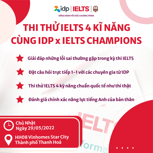 Tin vui cho bạn đây: Vào Chủ Nhật ngày 29/05/2022, lần đầu tiên tại Thanh Hóa, IDP IELTS phối hợp cùng IELTS Champions tổ chức sự kiện “Thi thử IELTS” HOÀN TOÀN MIỄN PHÍ cho tất cả mọi người!