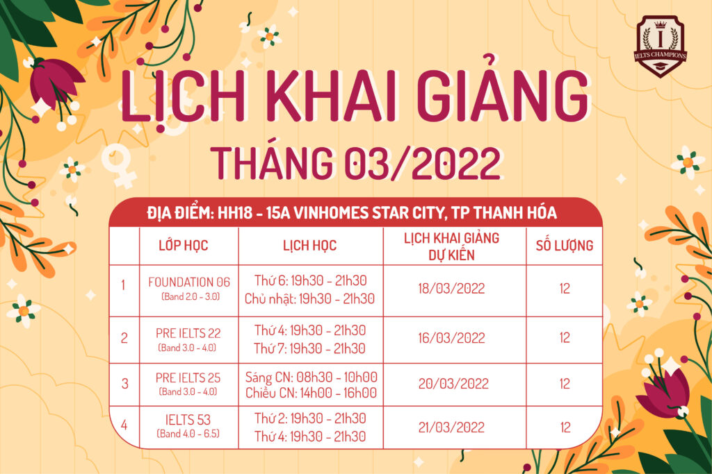 Lịch khai giảngLỊCH KHAI GIẢNG CÁC KHÓA LUYỆN THI IELTS TẠI IELTS CHAMPIONS THÁNG 03/2022 – LÊN TRÌNH IELTS, TỰ TIN CHINH PHỤC ĐẠI HỌC Posted on 19 Tháng 3, 2022 by Content 19 Th3