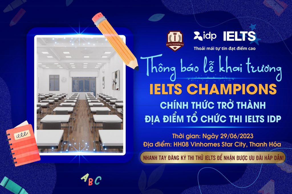 Với nhiều năm là đối tác vàng của IDP, IELTS Champions vinh dự trở thành địa điểm thi cấp chứng chỉ IELTS duy nhất tại tỉnh Thanh Hóa, hứa hẹn sẽ mang tới cho các bạn học viên những kỳ thi: CHẤT LƯỢNG – UY TÍN – CHÍNH XÁC.